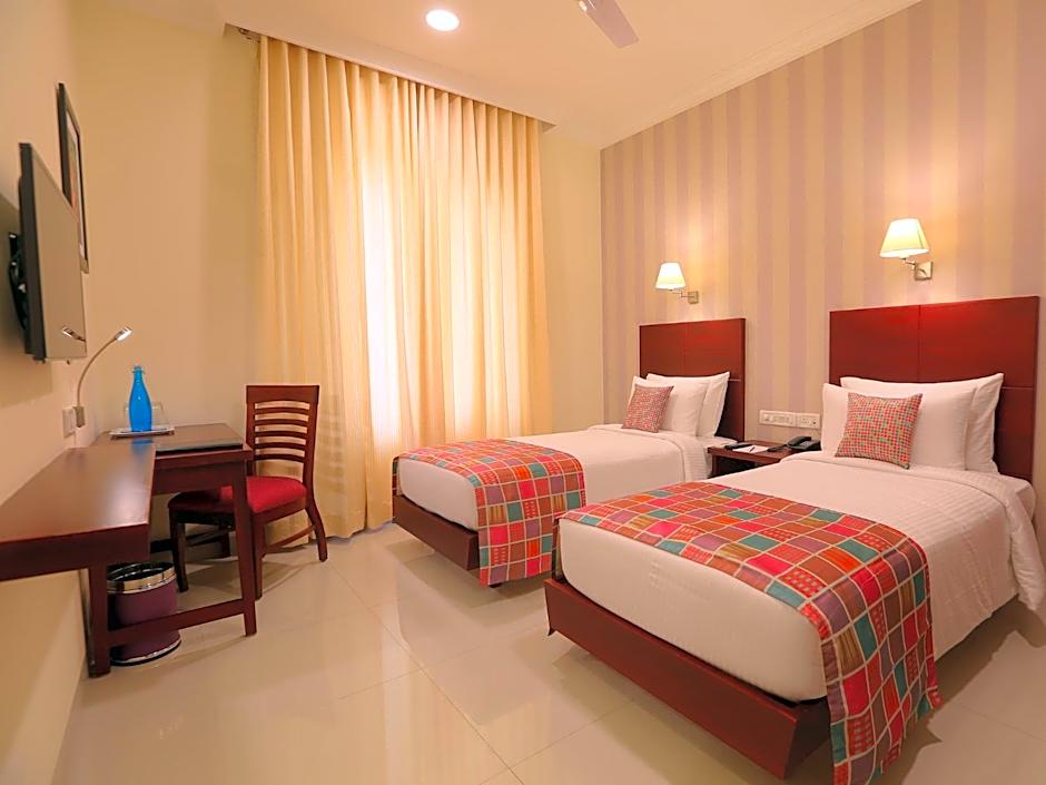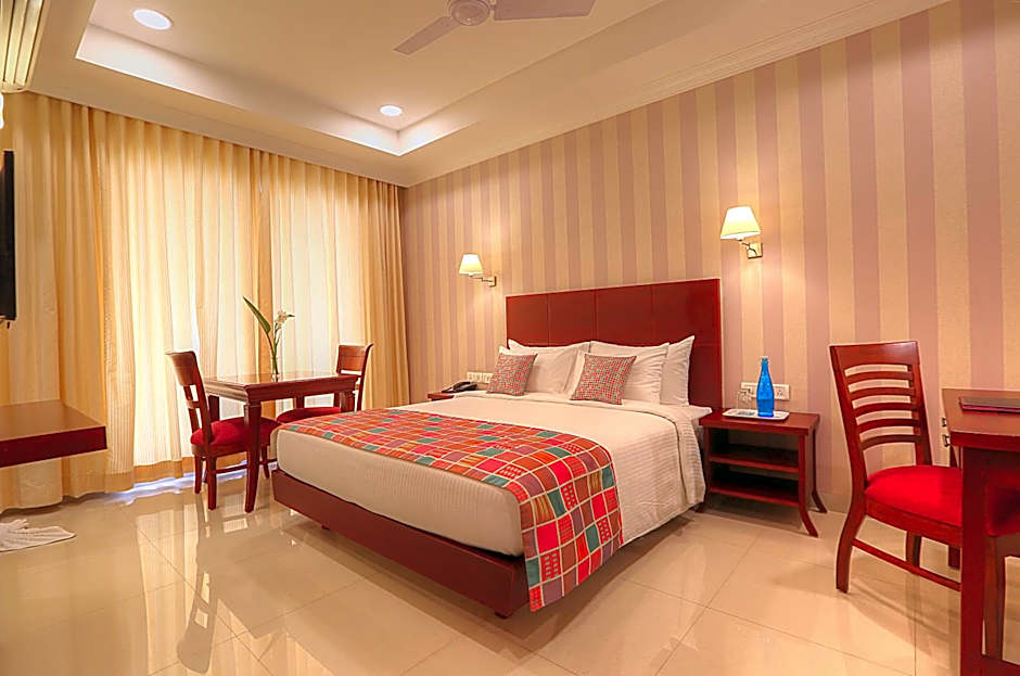 This room features a queen size bed, electric kettle, stove top, refrigerator and microwave oven.